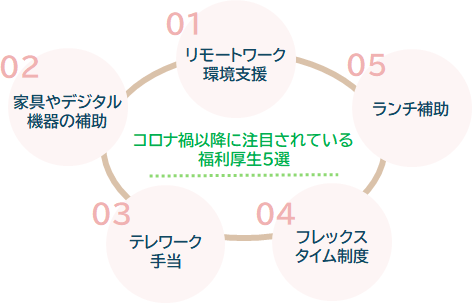 コロナ禍をきっかけに、働き方や従業員のニーズは大きく変化しました。コロナ禍以降に注目されている福利厚生5選は以下の通りです。