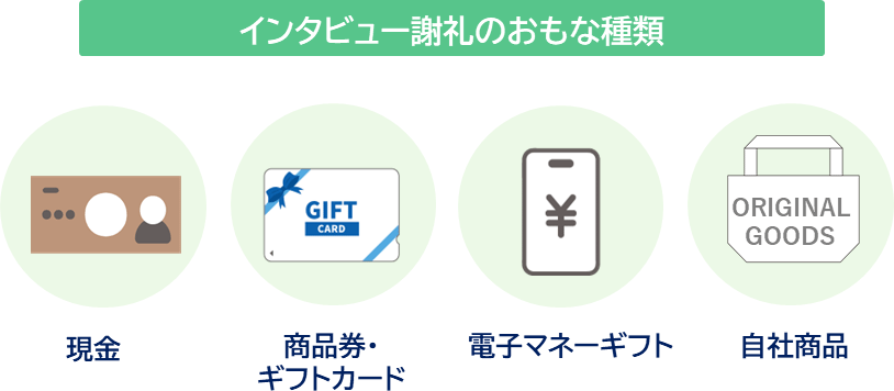 インタビュー謝礼には、現金やギフトカード、自社製品、ノベルティ、電子マネーギフトなどがあります。それぞれに使いやすさや運用の手間、コスト面で違いがあるため、目的や対象者に合わせて選ぶことが大切です。ここでは各謝礼の特徴などを解説します。