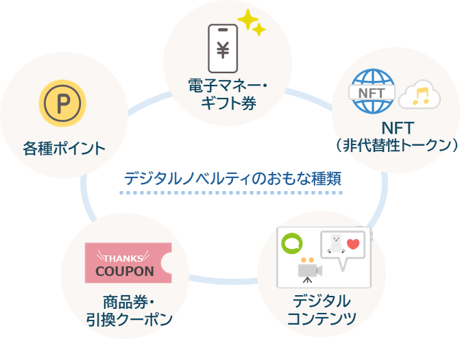 ひと口にデジタルノベルティといっても、提供される形式や用途はさまざまです。電子マネーやポイントのように実用性の高いものから、話題性や参加体験を重視したものまで、それぞれに特徴があります。ここでは代表的な種類ごとの特性や活用シーンを解説します。