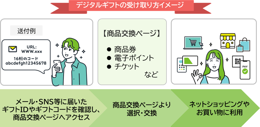 デジタルギフトを受け取る人は、受信したメッセージやURLから内容を確認し、商品券・電子ポイント・チケットなどに変換します。
