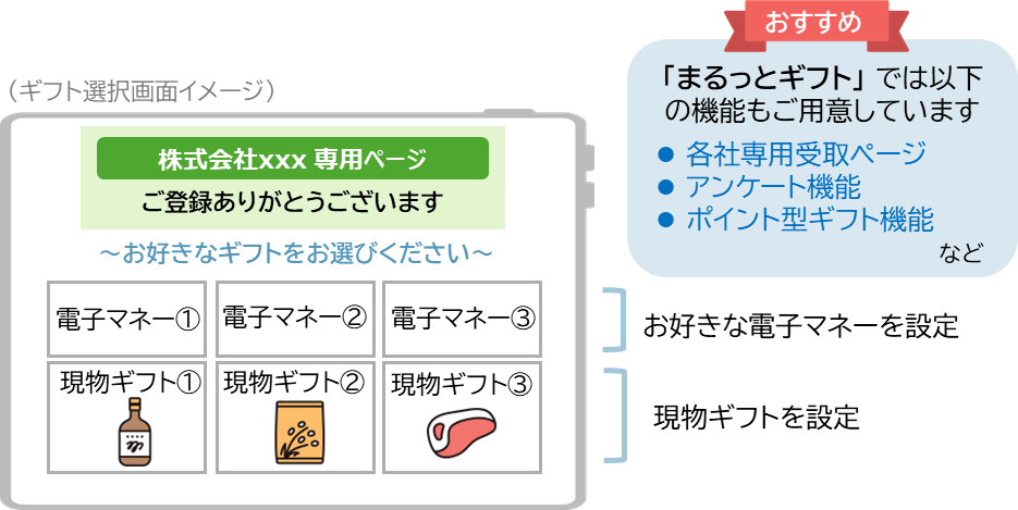 「まるっとギフト」は、複数の電子マネーや電子ポイントの他、商品券やカタログギフトにも交換できるデジタルギフトです。配送が必要な商品券やカタログギフトもデジタルギフトのラインナップに含めたい場合は「まるっとギフト」がおすすめです。